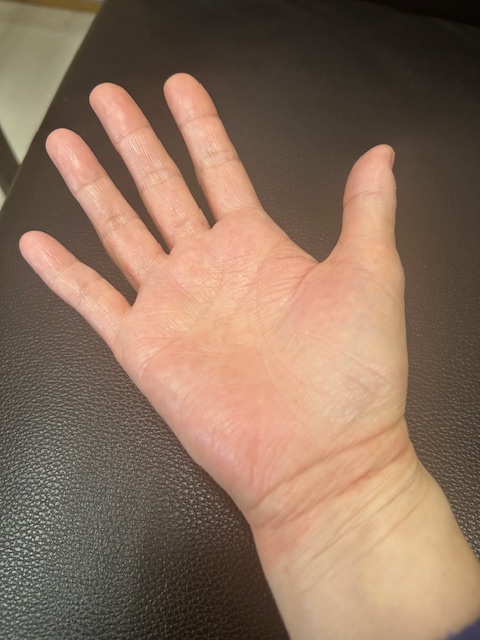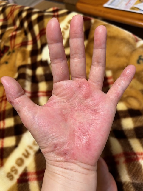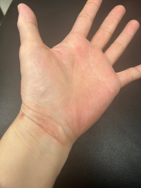 これはさきほど撮った写真です。少し赤いところがありますが、かゆみはありません。手の赤みも減ってきました。